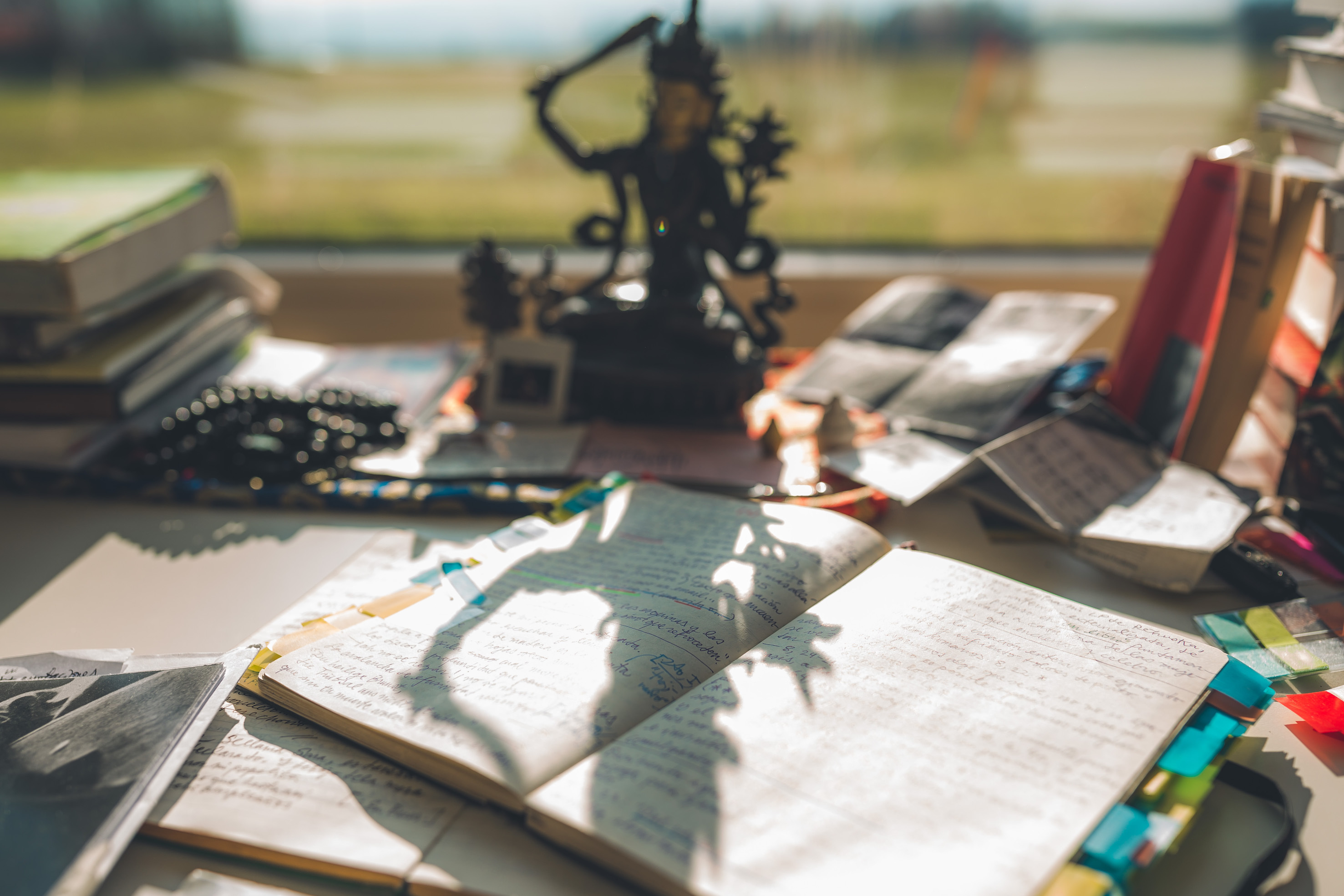 Soy un viajero obstinadamente poco práctico: mi equipaje puede resumirse como una delgada capa de ropa sobre un fondo de libros y más libros y cuadernos. A Looren traje incluso una estatuilla de una deidad budista, Mañyúshri, “buda del habla iluminada”: un San Jerónimo de 16 años, con una flor que germina de un mudra en su mano izquierda, forjado en bronce, del porte de una copa de vino. Un santo patrono para que velara sobre mi mesa de trabajo, ya que en Looren traduciría aforismos budistas del tibetano al castellano. Gracias a que la biblioteca de Looren incluía compilaciones de aforismos de distintas tradiciones, pude modular mejor el tono de mis traducciones y notar paralelos transculturales, como en el siguiente aforismo de Sakya Pandita (Tíbet, 1182-28) que se asemeja a nuestro dicho “nadie es profeta en su tierra”: